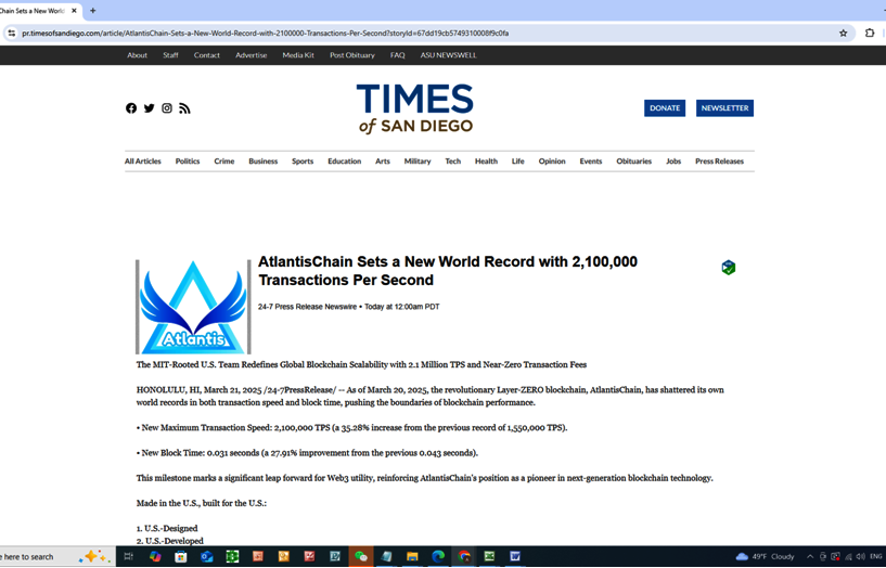 Times of San Diego: AtlantisChain Sets a New World Record with 2,100,000 Transactions Per Second