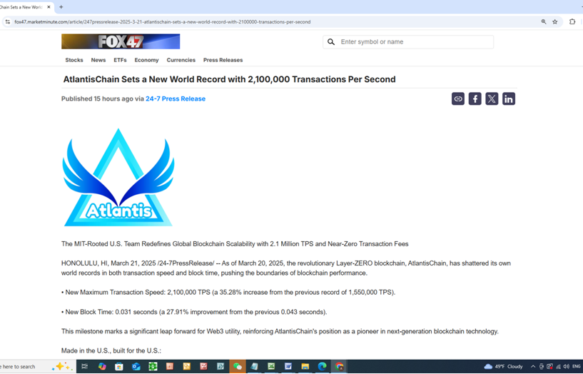 Fox 47: AtlantisChain Sets a New World Record with 2,100,000 Transactions Per Second
