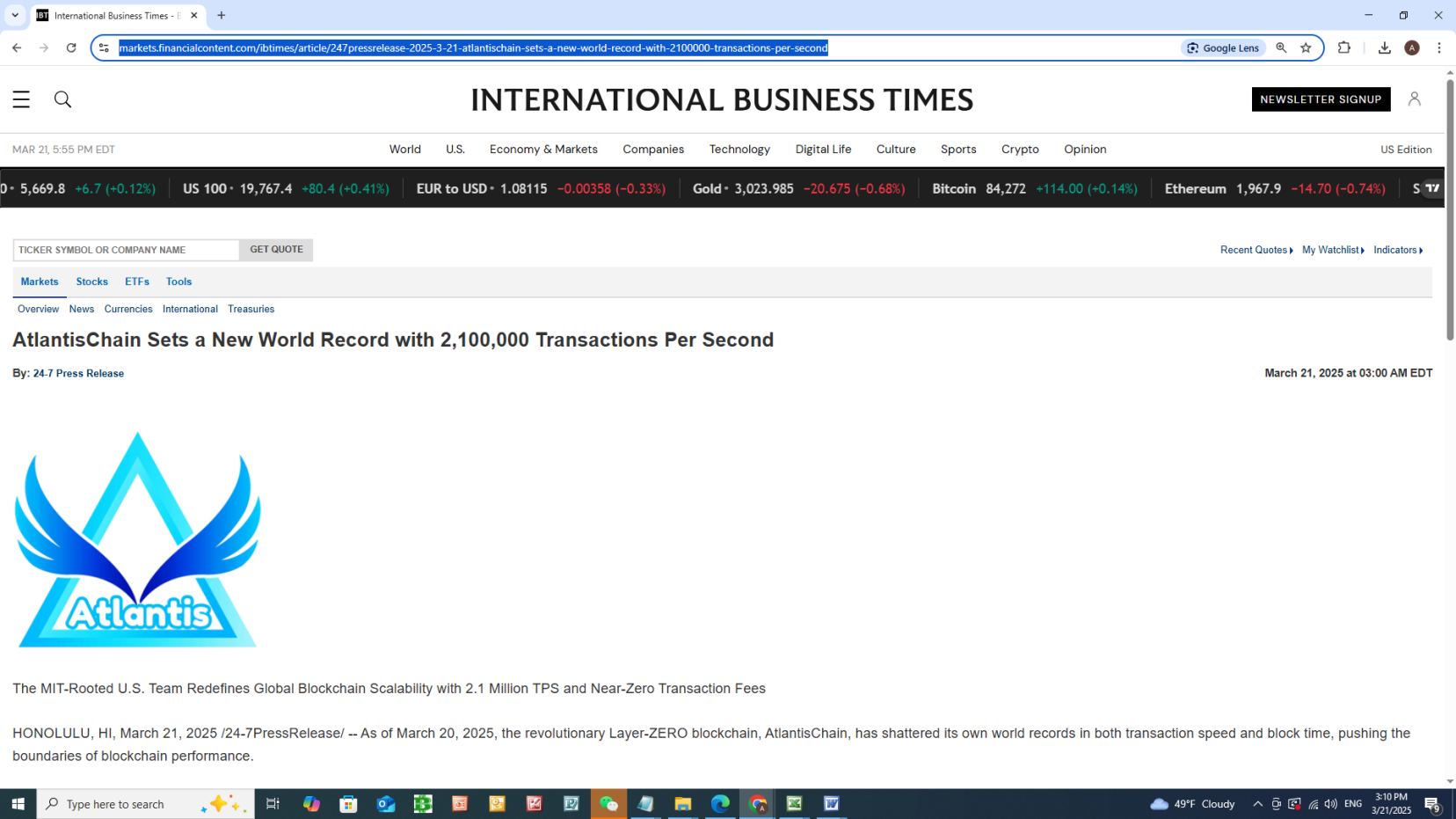 International Business Times: AtlantisChain Sets a New World Record with 2,100,000 Transactions Per Second